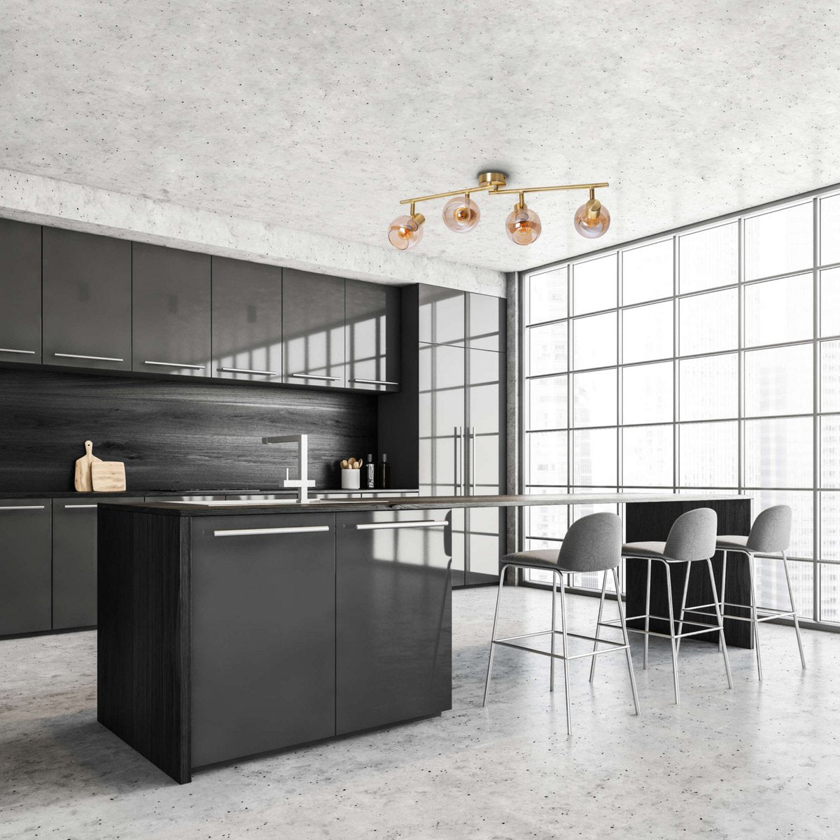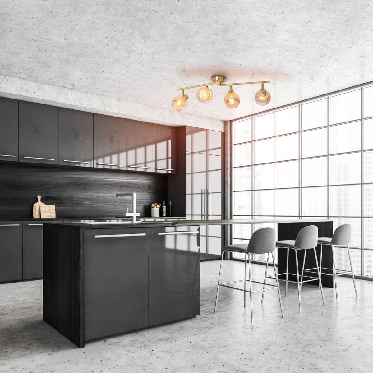 4er spot/plafondlamp "libby", klassieke plafondlamp gemaakt van messing gekleurd metaal en getinte glas in barnsteen, met E14-aansluiting, voor eetkamer, woonkamer, gang of kantoor, 80 cm lang