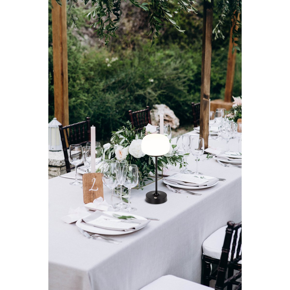 LED -batterij/ tafellamp "Pina" 30 cm hoog, gemaakt van metaal (zwart) en glas (wit), geïntegreerde LED's, warm wit